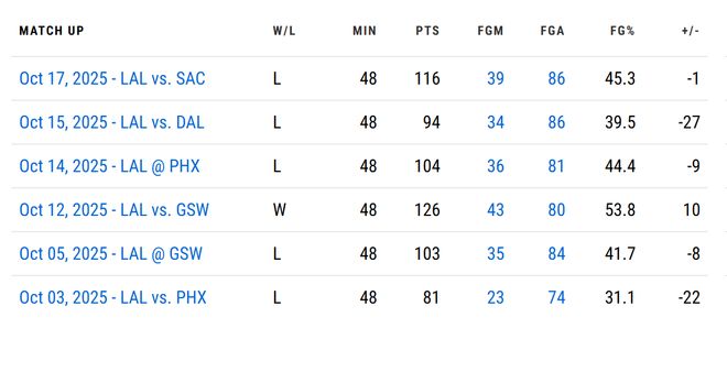 季前赛中詹姆斯因为坐骨神经痛没有打,常规赛他也将缺席一段时间,季前赛中没有詹姆斯的湖人表现不理想,他们战绩1胜5负,净输了57分,具体表现为:两战太阳都输了,分别输了22分和9分,两战勇士1胜1负,赢了10分,输了8分,输给独行侠27分,输给国王1分。